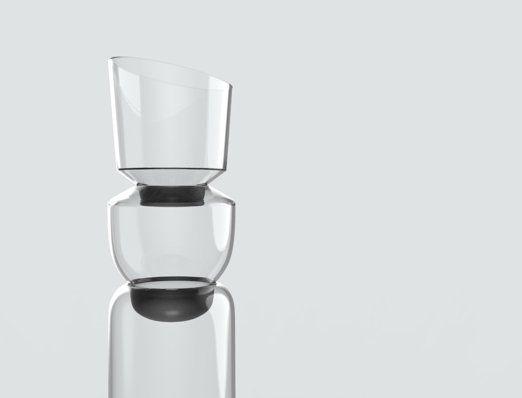 To create the inner natural stream system, using the transparency of glass, make the process of extraction can be seen directly. Different containers involve different functions. The top funnel was designed for easier water pouring. The second container is the mineral extractor, includes various nutritious rocks that allow customers to choose by different healing efficacy. Finally, the bottom part is for receiving the clean extracted water. During the process, making an elegant and functional utensil that is stackable and can be customized became our priority mission